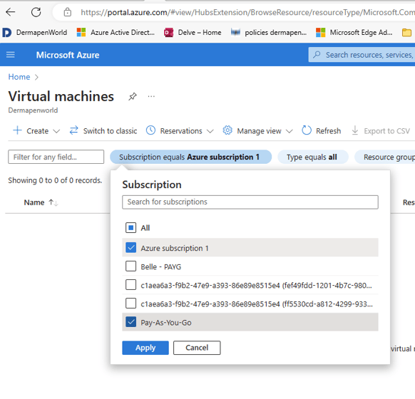 - Once you you load Virtual machines , you need to click on subscriptions to ensure you can see "Pay As You Go" subscription