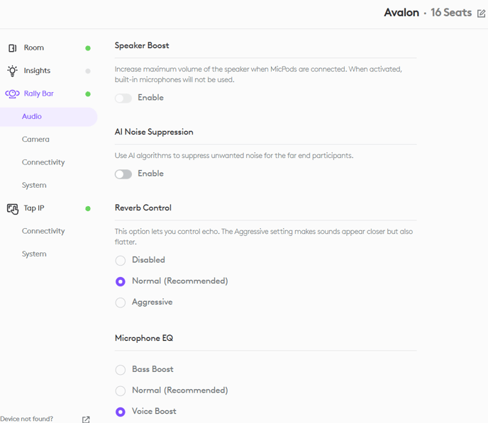 If you select a room you can manage the audio and camera settings under the Logitech Rally